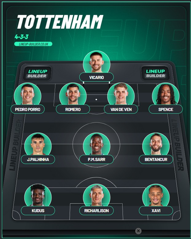 Senast mot Wolves spelade Frank en 4-2-3-1 uppställning med (på papperet) två defensiva mittfältare bakom Bergvall. Tror att han denna gång går tillbaka till en ren 4-3-3 där Palhinha lär starta. I övrigt är det bara att snurra tombolan. Bergvall har startat de två senaste matcherna men inte lyckats särskilt bra så jag tror han ställs utanför startelvan denna gång. Bentancur verkar vara en liten Frank favorit så han tar nog en av de två resterande platserna. Vore dock spännande att få se Gray i sexa rollen från start men tror inte det. Kvar att spela blir således Sarr. Som när han har dagen kan vara otroligt bra och jag hoppas att lördagen är en sådan dag.