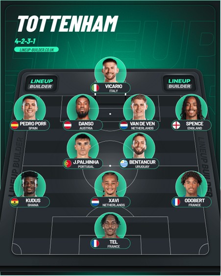 Anfallet: Fronttrion är inte riktigt lika given eftersom ingen riktigt tagit chansen att göra positionen till sin egen. Undantaget naturligtvis Kudus som startar på högerkanten. I mitten kan det bli Richarlison, Tel eller en debut för Kolo Muani. Till vänster borde Odobert få chansen igen om han är spelklar efter smällen/känningen mot Monaco. Spelar inte Odobert kan det bli Tel på den kanten i stället. De senaste veckorna har Frank satsat på Richarlison i Champions League (eftersom Tel inte är med i truppen för CL) och sedan använt Tel i ligan. Jag tror att han var rätt nöjd med Tel i senaste bortamatchen mot Leeds. Av den anledningen tror jag på Tel i mitten och Odobert på kanten, med byten in för Muani/Richarlison med 15–20 kvar.