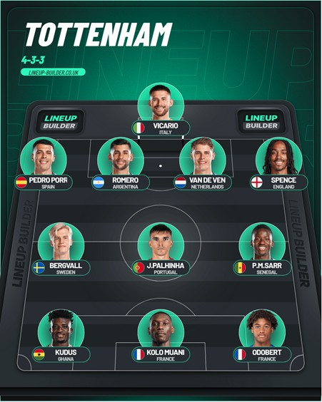 Enligt Thomas Frank är alla som var tillgängliga för Fulham även tillgängliga för Newcastle. Romero kommer tillbaka efter sin avstängning. Gissar att Spence kommer in i stället för Udogie som var sällsynt misslyckad mot Fulham. På mitten skulle det kunna bli tillbakagång till det som Frank känner sig säkrast med defensivt, dvs Palhinha och Bentancur i par. Jag hoppas och tror dock att han väljer att mer dynamiskt och tempostarkt mittfält där Palhinha får sällskap av Sarr och Bergvall. Framåt bör det bli Kudus, Muani och Odobert tänker jag, så att vi kan hota Newcastles backlinje med speed och teknisk skicklighet 1 mot 1.