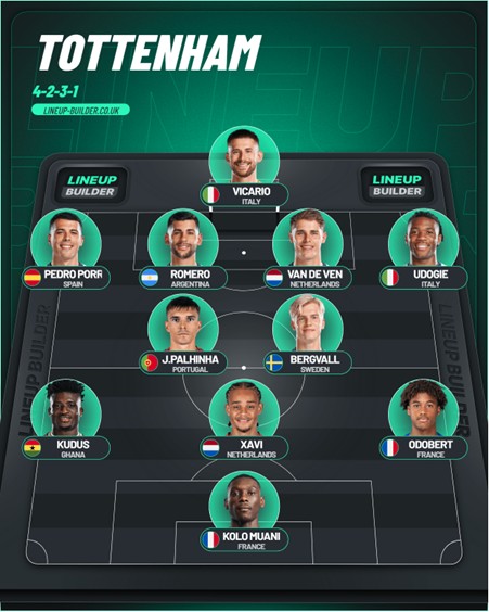 För att åstadkomma det behöver vi ett dynamiskt och spelande mittfält, med Bergvall och Xavi i de två offensiva rollerna. Den defensiva rollen får antingen Bentancur eller Palhinha ta hand om. Ingen av dem är egentligen bra nog i passningsspelet framåt men vi får ta vad vi har. Backlinjen tar i princip ut sig själv med Porro, Romero, van de Ven och Udogie. Udogie är bättre framåt än Spence och bör starta om han är skadefri. Fronttrion tänker jag mig att det blir Kudus, Muani och Odobert för att försöka hota Brentford i 1 mot 1-lägen på kanterna.
