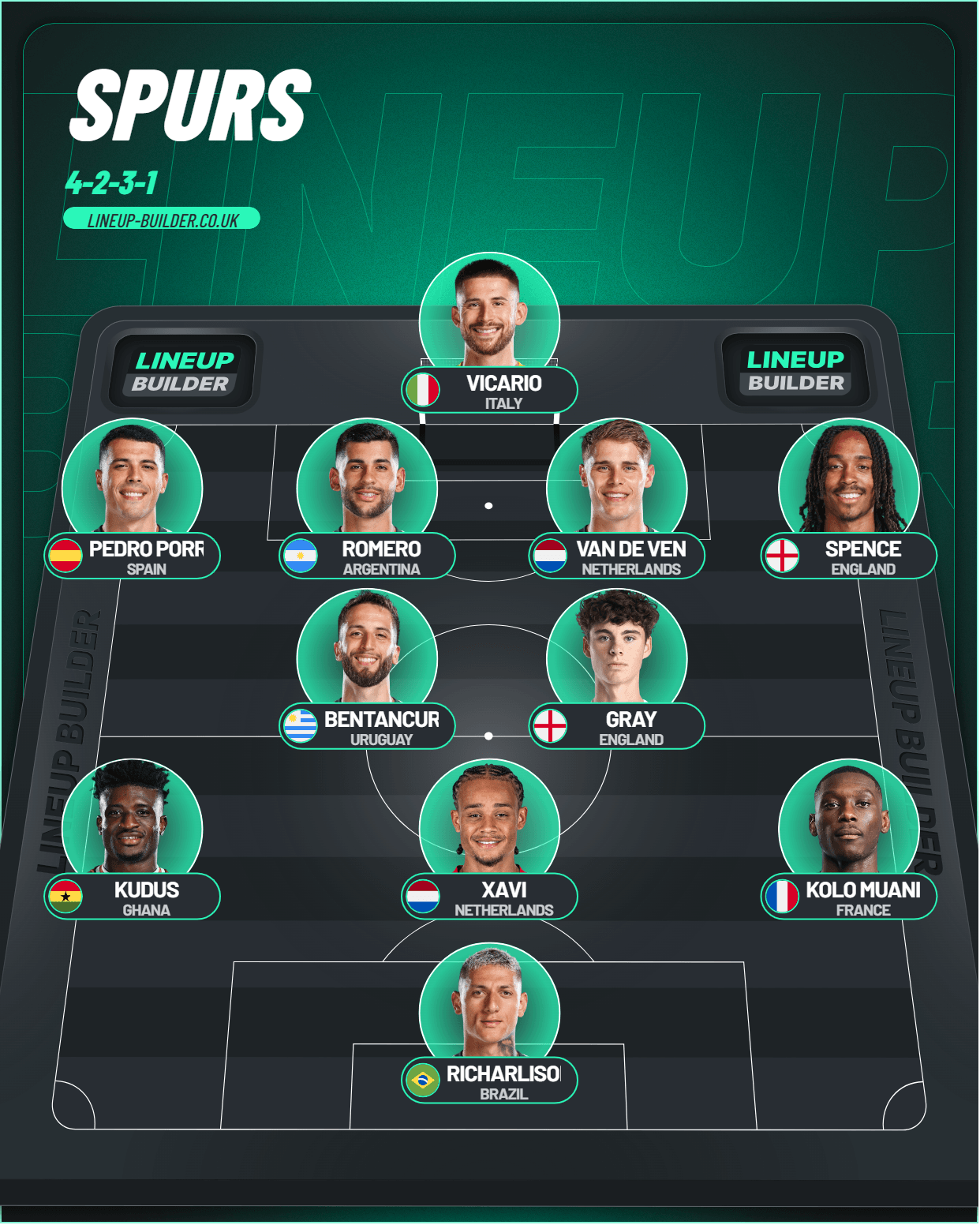 I Spurs är det inte mycket nytt kring skador mer än att Brennan ska vara tillbaka, frågan är om har får chansen mot sitt gamla lag, det troliga är nog dock att han får nöja sig med bänken. Att Vicario vaktar kassen är solklart. I försvaret är frågan om det inte vore nyttigt att låta Davis spela och kanske vila Spence som spelat mycket. På mitten tror jag man roterar en del även om det kanske egentligen inte är nödvändigt då spelschemat ändå känns överkomligt närmsta månaden. Bentancur kommer nog in och Gray får säkert chansen igen efter att har gjort det bra. Framåt blir det nog oförändrat mot Brentford. Detta ger ett lag om: Vicario; Porro, Romero, Van de Ven, Spence; Bentancur, Gray; Kudos, Simmons, Kolo Muani; Richarlison.