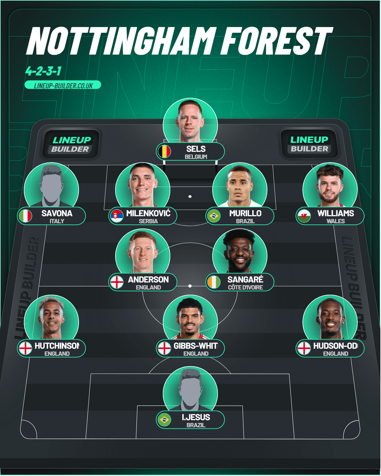På skadefronten har man haft det jobbigt med spelare som Aina, Wood, Gunn, Awoniyi, Seis och Yates. Målvakten Seis har dock inte kastat in handduken helt varpå det troliga är att han står på söndag. Detta ger en trolig startelva om: Sels; Savona, Murillo, Milkenkovic, Williams; Hutchinson, Sangaré, Anderson, Hudson-Odoi; Gibbs-White; Jesus.