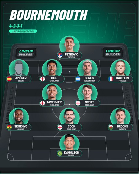 Senaste uppdatering v g skador; Ben Gannon-Doak, Tyler Adams och Ryan Christie skadade och borta sedan tidigare, Veljko Milosavljevic är på väg tillbaka och ska testas sent inpå match för att se om han kan starta. Justin Kluivert ska ha dragit på sig en knäskada i senaste matchen mot Arsenal, kommer således inte till spel.