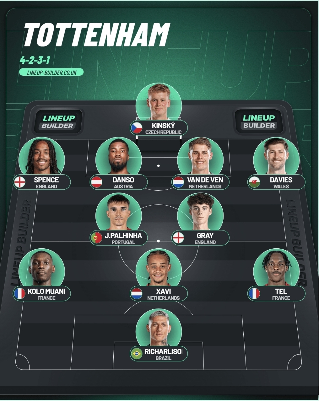 Om det blir så, om Frank vågar det, skulle man kunna tänka sig att det framför Kinsky blir Spence till höger?, Danso, Van de ven och Davies. På mitten känns trean given med Palhinha, Gray och Simons. De tre där framme blir Tel, Richarlison och Muani. Vore kul om t ex Scarlett fick komma in, men nog inte så troligt.