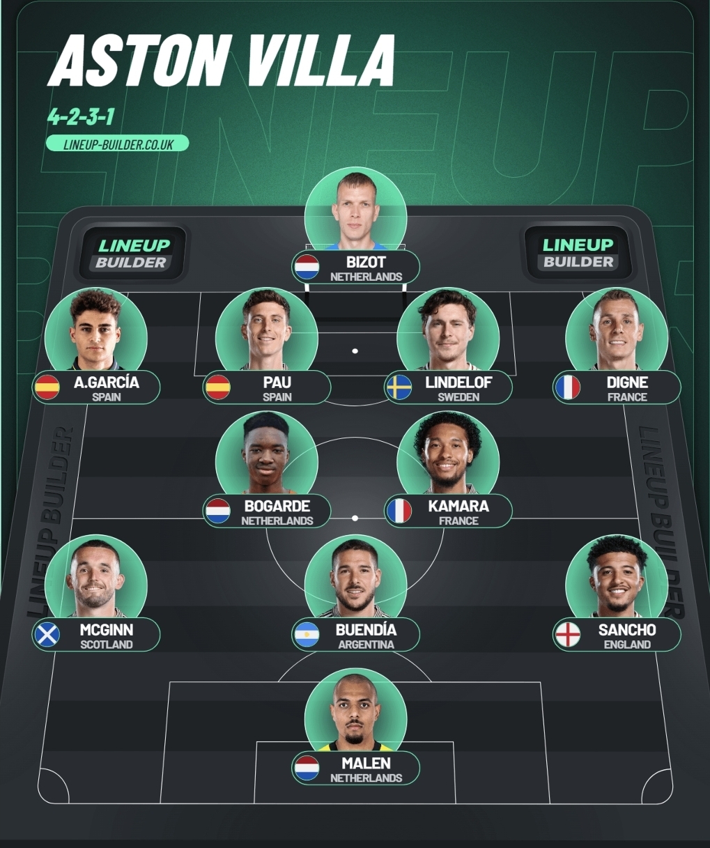 Jag tror att det blir ett delvis roterat lag från Villas sida, vi får se hur hårt de satsar. Bizot verkar vakta kassen i stället för Martinez, och sedan får vi se. Möjligt också att man vilar spelare som Tielemans, Rogers, McGinn och Watkins.