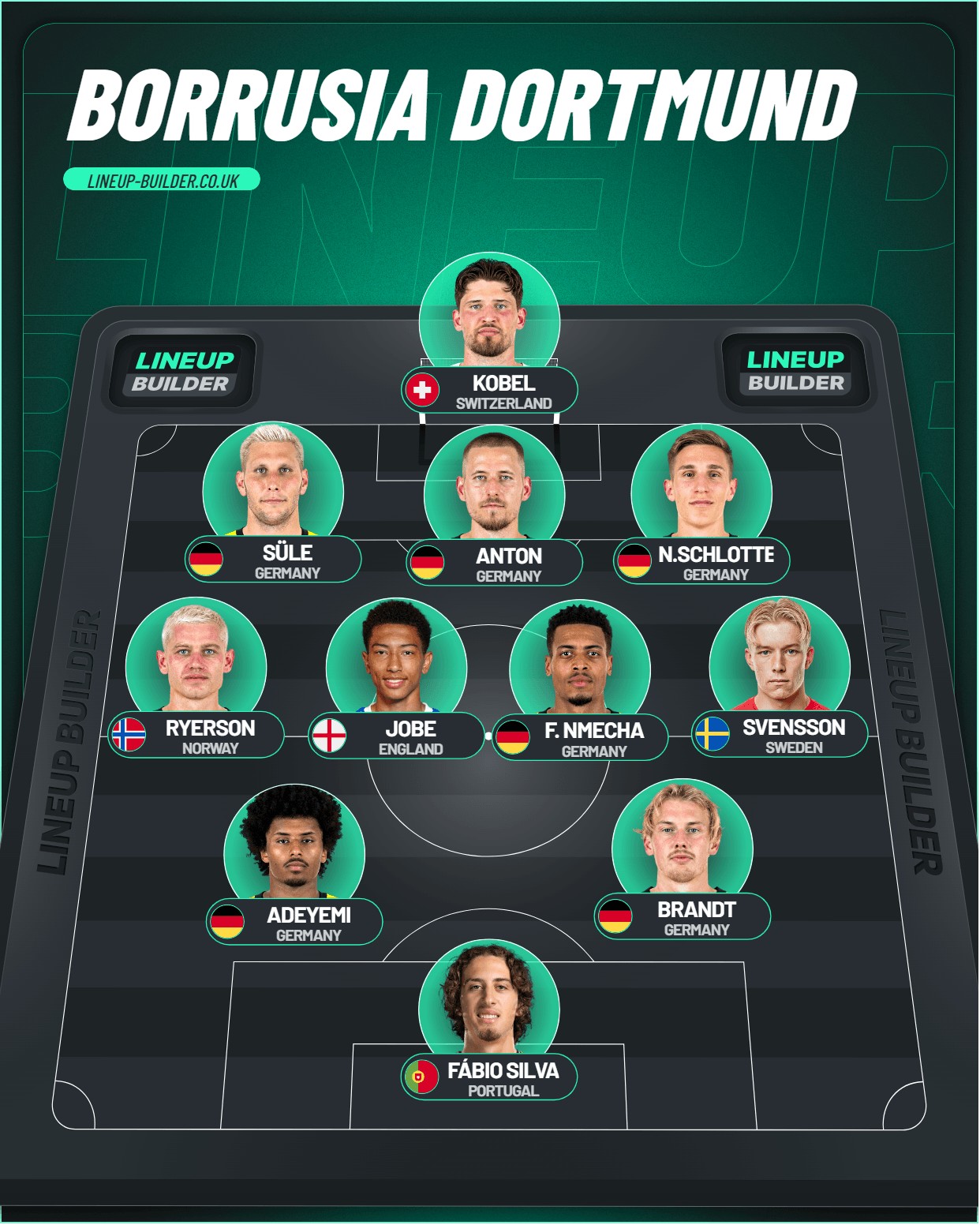 Det är ett i stort sett skadefritt Dortmund som kommer till London, Bensebaini och Anslemino är åter i matchtruppen, men Sabitzer står kvar på skadelistan och det är såklart ett avbräck för Dortmund. Dortmund kan ställa upp med följande startelva: