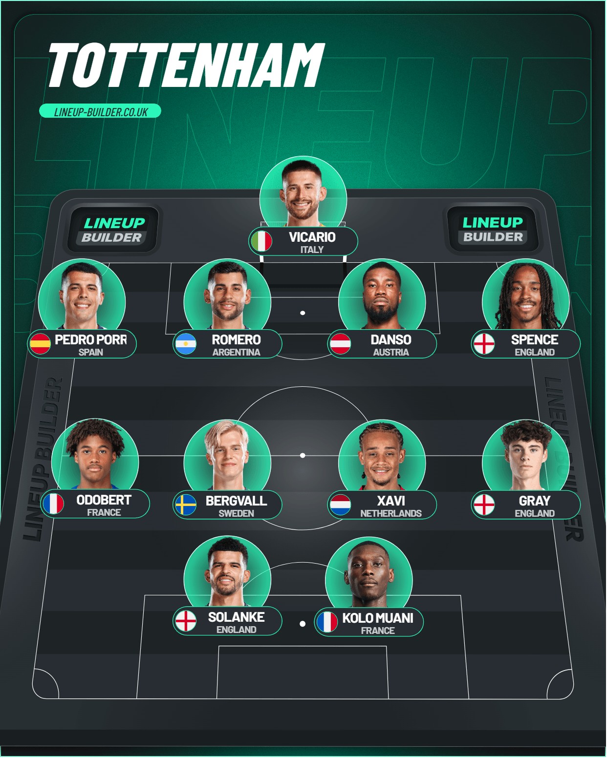 Maddison, Kulusevski, Bentancur, Richarlison, Davies, Kudus och Palhinha är alla borta med skador. Sarr är på väg hem från AFCON (där han förövrigt blev både matförgiftad (troligtvis) och afrikansk mästare på samma kväll). Bissouma, Tel, Suoza och Gallagher är inte inskrivna i truppen. Van de Ven är avstängd i en match. Totalt 13 spelare alltså som inte kommer komma till spel. Dessutom fick både Gray och Xavi utgå från matchen pga smällar, men båda skall enligt Frank vara tillgängliga för morgondagens match. Detta gör att urvalet inte är speciellt stort och jag tror på följande startelva: