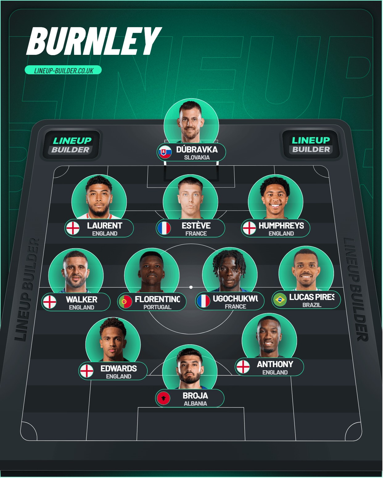 Gällande spelartruppen lider även Burnley av en del skador, Cullen, Amdouni, Roberts och Tresor är alla borträknade, dock är Worral och Flemming tillbaka i träning och kan vara aktuella för spel på lördag. Möjlig uppställning för Burnley: