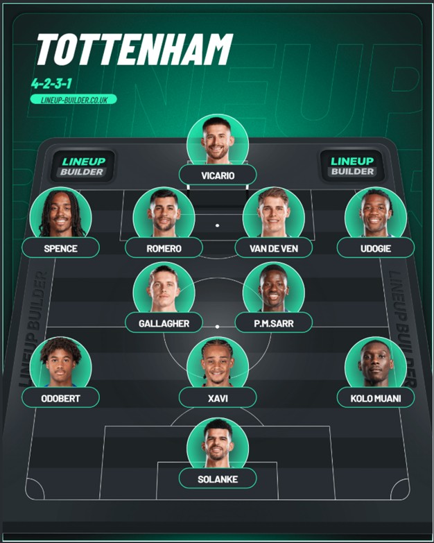 I Tottenham fortsätter skadeeländet. Porro förmodligen borta längre liksom Danso. Listan på våra skadade spelare växer för varje vecka. Till synes ”små/enkla” skador tar lång tid. Det nyligen stängda transferfönstret var väl inget som tillförde så mycket på den fronten. I och för sig kom Gallager in tidigt i fönstret men övriga är inga som går in och gör skillnad dag 1. Dock gjorde vi oss av med ett gäng spelare, mestadels på lån, där några har PL erfarenhet. Så de senaste matcherna har vi knappt fått ihop en start 11 med seniorspelare, något som också Romero ventilerade på sociala medier i veckan. I startelvan mot City var Dragusin tillbaka. Han stod inte för någon större insats och verkade mest förvirrad. Jag hoppas och tror att Franks trebackslinje vi startade med mot City nu blir en rak fyrbackslinje nu när både Romero och Mickey ska vara tillbaka. Spence är ”Touch and Go” inför matchen och jag tror han få spela då Porro fortfarande är borta. Sarrs pigga inhopp vände matchen och jag tycker att vi spelar bättre mittfältsfotboll med honom på planen. Biss känns osäkrare och har en tendens att överarbeta och tappa bollen, ofta i sårbara lägen. Även om Palinha gjorde en riktigt bar insats mot City tror att han får lämna plats åt Sarr på det defensiva mittfältet. Gallager blir nog kvar där med då hav verkar vara lite av en Frank favorit. Solanke känns gjuten längst fram om han inte körde helt slut på kroppen senast. Även Xavi var bra och jag tror han tar 10 rollen i denna match. Odobert har gjort det riktigt bra de senaste matcherna så lite förvånad att han inte fick starta mot City men är förhoppningsvis tillbaka till denna. Tror även att Kolo få ta vänsterkanten i denna match igen även om Tel skulle vara ett alternativ där.