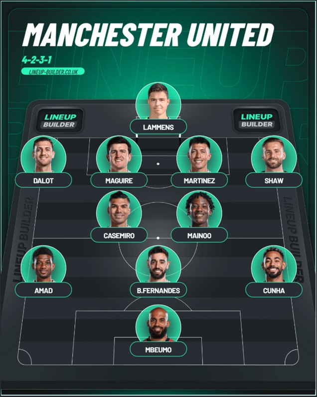 Till skillnad från Spurs har United en frisk trupp. Dorgu och De Ligt borta. Mount kan eventuellt vara tillbaka med kommer inte att starta mot oss. Jag tror att Carrick kör vidare med sitt 4-2-3-1 och Cunha fortsätter på vänsterkanten i stället för Dorgu.
