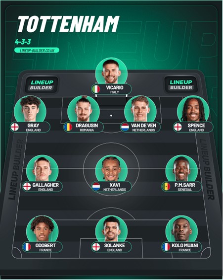Tottenhams laguppställning? Skadeläget gör att Frank får bolla med det han har och försöka få ihop en startelva som förhoppningsvis kan ta poäng mot Newcastle. Jag tror Spence kliver in på vänsterbacken, att Dragusin får fortsätta bredvid van de Ven och att Gray får ta högerbacken. Det skulle ge ett mittfält av Gallagher, Sarr och Xavi samt Muani, Solanke och Odobert framåt. Jag skulle kunna se Tel i stället för Muani, men Frank verkar inte vilja ge Tel chansen från start längre.