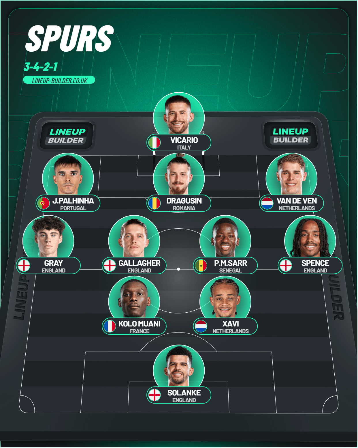 Senaste rapporterna gör gällande att både Porro och Richarlison samt även Udogie inte är tillräckligt fit för att starta. Möjligtvis att någon av dom tar plats på bänken men känslan är tyvärr tveksam. Detta samt att Odobert gick ut långtidsskadad mot Newcastle gör att alternativen är få och att dom som är friska spelar. Detta ger: Vicario; Gray, Dragusin, Van de Ven; Palhinha, Spence; Gallagher, Sarr; Kolo Muani, Simons; Solanke.