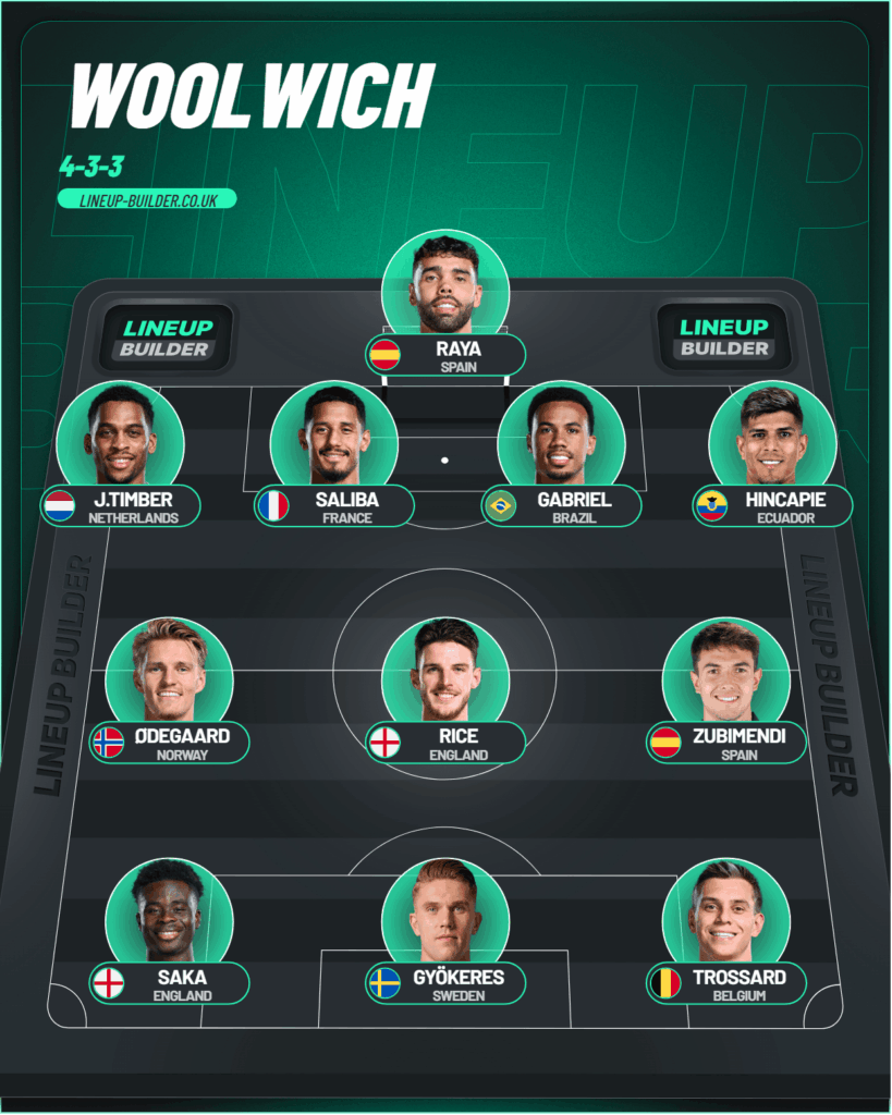 Trolig startelva: Raya; Timber, Saliba, Gabriel, Hincapie; Ødegaard, Zubimendi, Rice; Saka, Gyökeres, Trossard