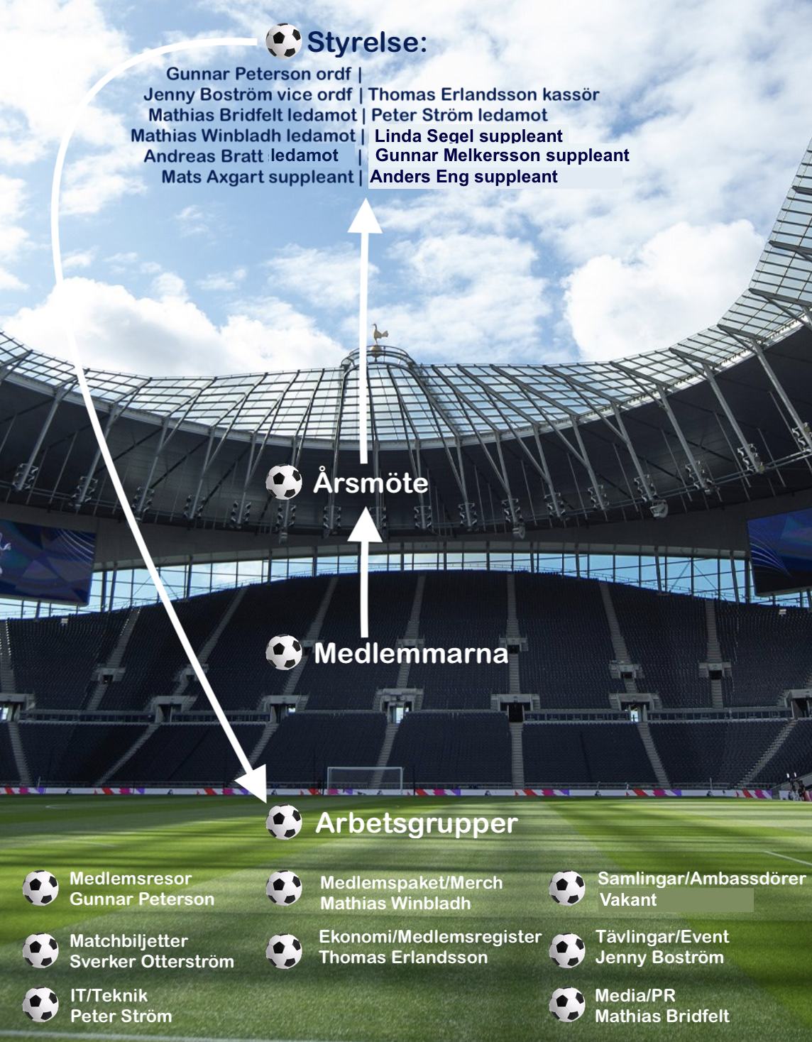 På årsmötet i början av 2023 presenterades ett nytt organisationsupplägg för supporterklubben, med åtta mindre arbetsgrupper som rapporterar till styrelsen. Och Styrelsen som rapporterar till medlemmarna via årsmötet och löpande under året i nyhetsartiklar och mötesprotokoll om verksamheten. I arbetsgrupperna kan även medlemmar arbeta som inte är invalda i styrelsen. **Uppdaterad Nov 2025.